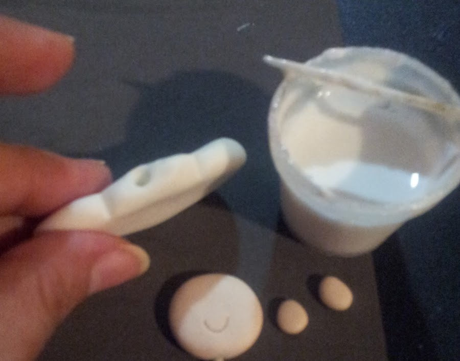4) Para el cabello, Aplanamos con la mano una porción de porcelana marrón, buscando la forma redondeada, utilizando pegamento blanco unimos y modelamos con los dedos la forma del cabello, según se indica en las fotos.