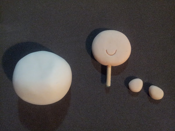 2) Para hacer la nube, podemos utilizar un patrón o cortador, en ese caso: aplanaríamos una porción de masa blanca utilizando rodillo, para luego aplicar el molde o cortador. En mi caso, modelé una forma irregular, un tanto ovalada, y plana. Luego con la esteca hundí en cuatro puntos, para hacer la figura de nube.