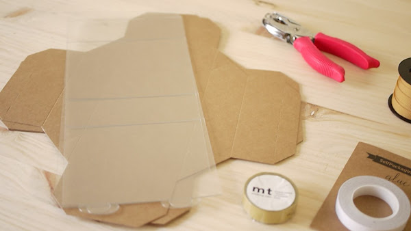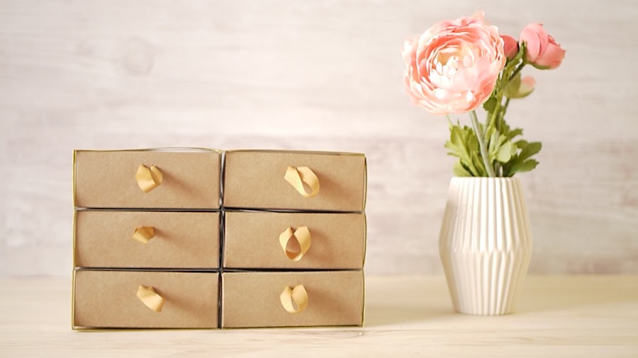 Lo primero es montar las cajitas siguiendo el paso a paso del vídeo que tienes en la web y luego hacer dos orificios con la perforadora para pasar la cinta dorada y hacer el tirador.