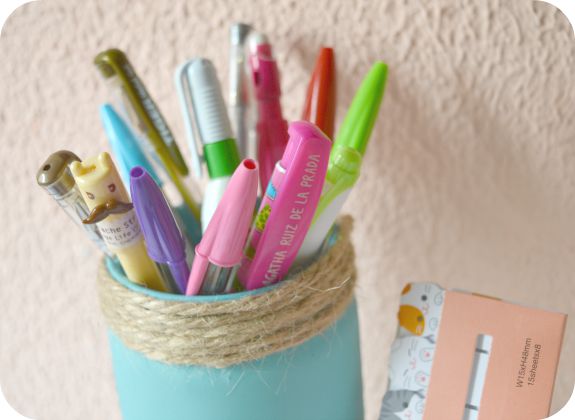 Hacerlo no tiene ningún misterio. Simplemente necesitas unos botes de diferentes tamaños, para poder así dar cabida a los diferentes artículos de papelería que tienes, pintura en spray PintyPlus ( en mi caso es la chalk paint en color gris ceniza, rosa pétalo y turquesa pálido ), un poco de cuerda y pegamento.