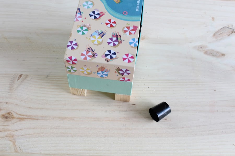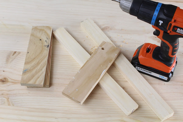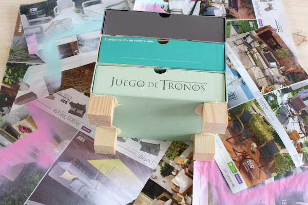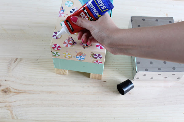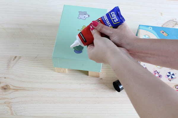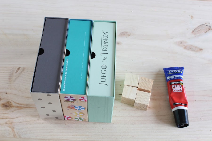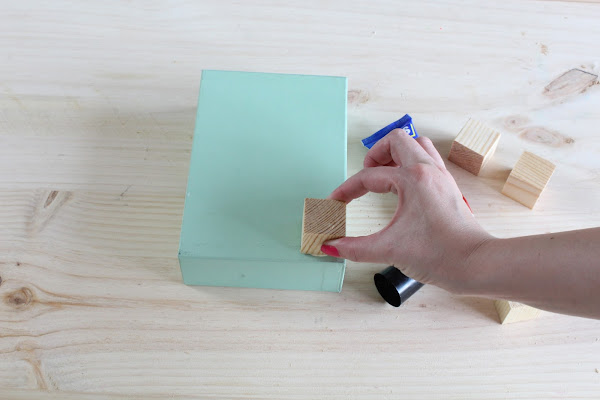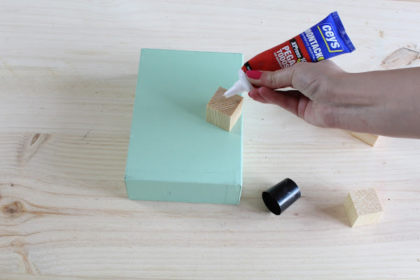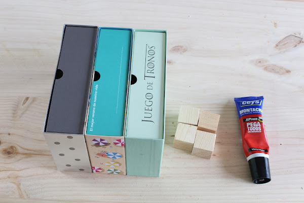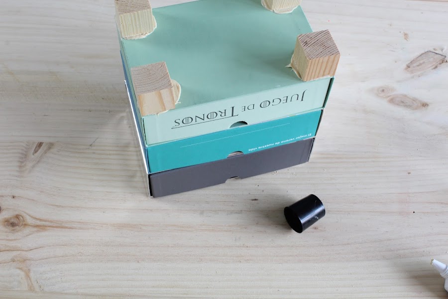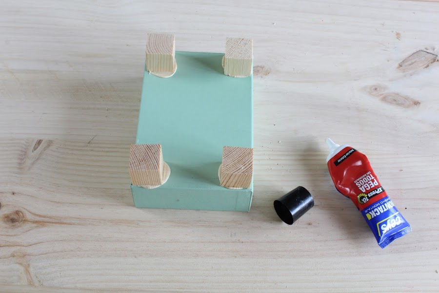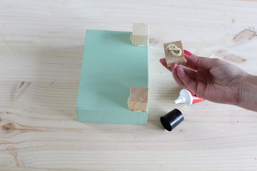 1 Paso: Pegaremos en la parte inferior de uno de los cajones los cuadrados de madera a modo de patas.