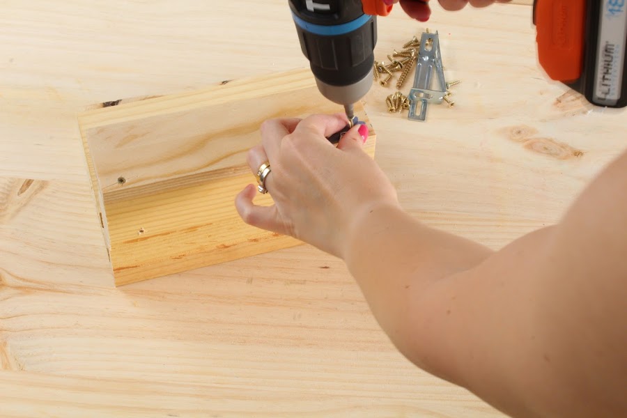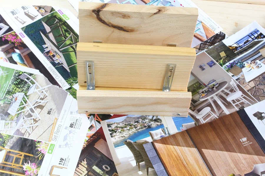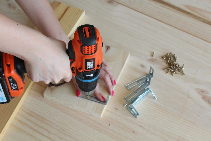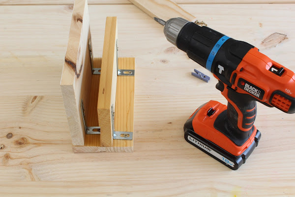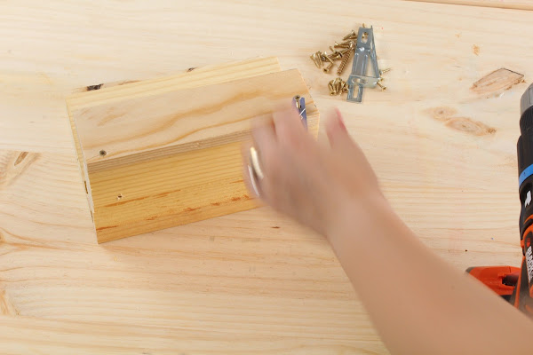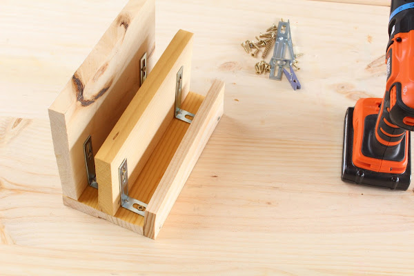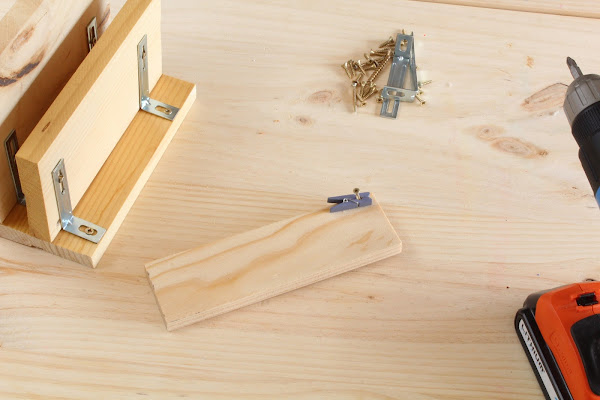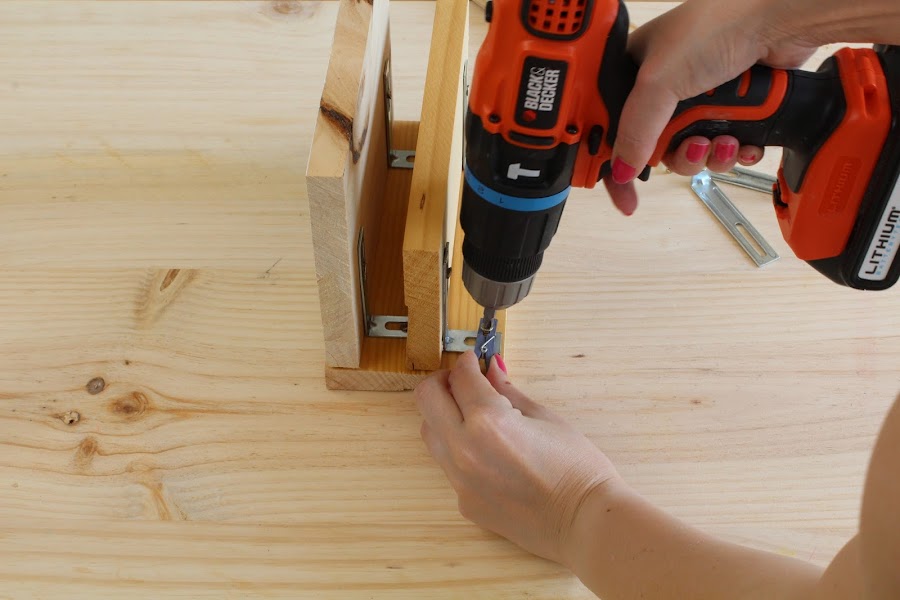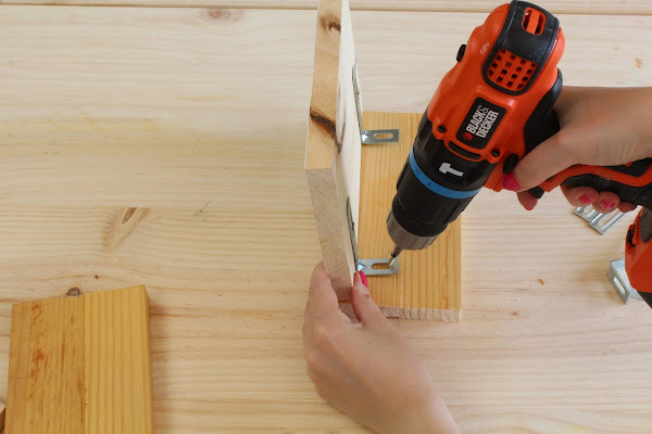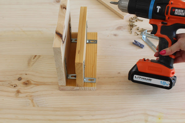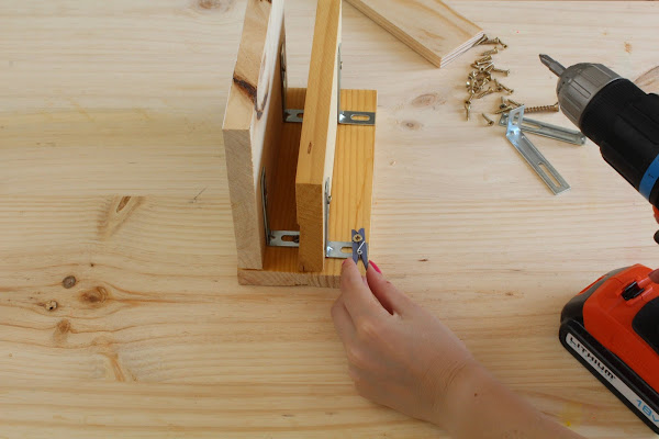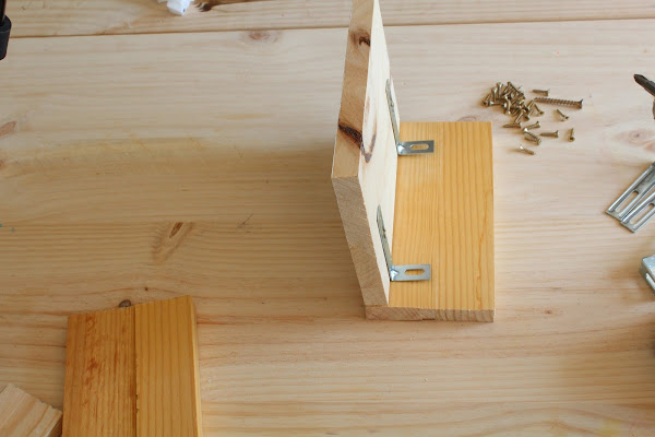 1 Paso: Usaremos como base una de las madera de 10cm x 20cm, empezaremos colocando la parte posterior, sera la madera de 15cm x 20 cm, la atornillaremos a la base con las escuadras de metal ( Yo he reutilizado unas de Ikea que venían con unas estanterías).