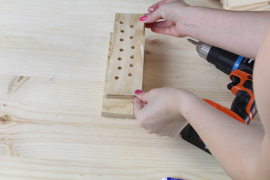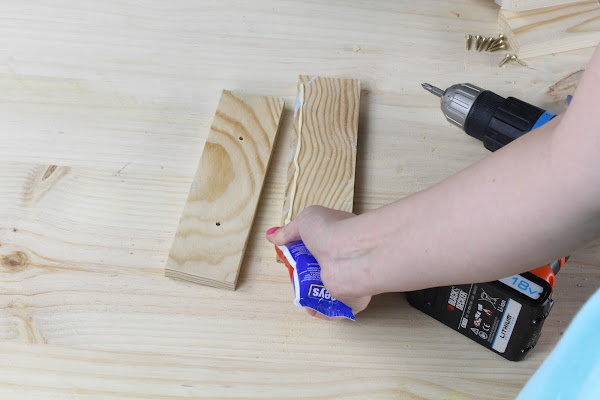 3 Paso: Colocaremos la madera de 6cm x 20cm, para ello pegaremos primero para que nos sea más fácil atornillar.