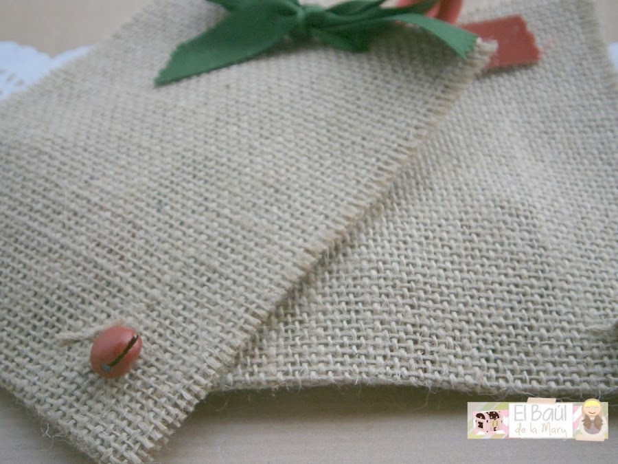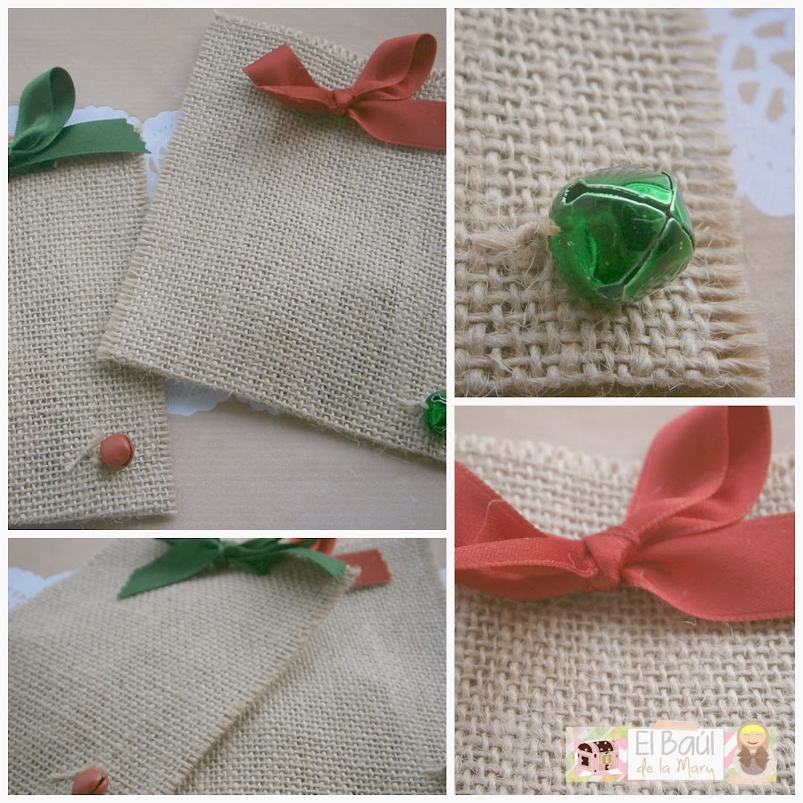 Para la ocasión, elegimos una tela de saco (que para nuestro gusto es preciosa y tiene infinidad de posibilidades) un lazo grande para cerrarla, y un cascabel para darle un poco de vidilla y espíritu navideño.