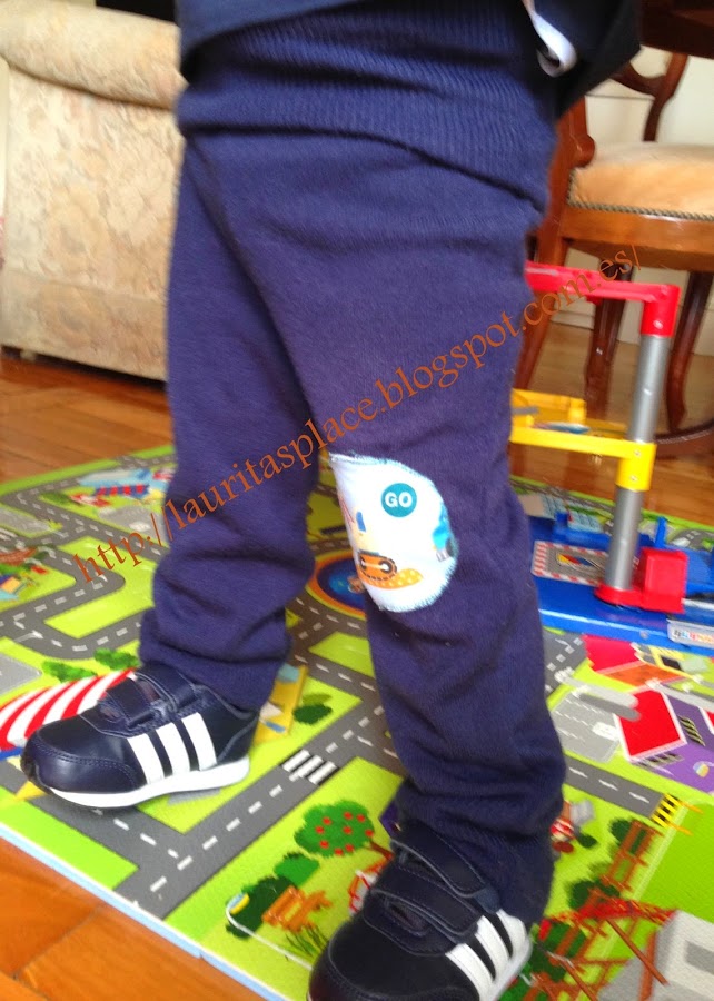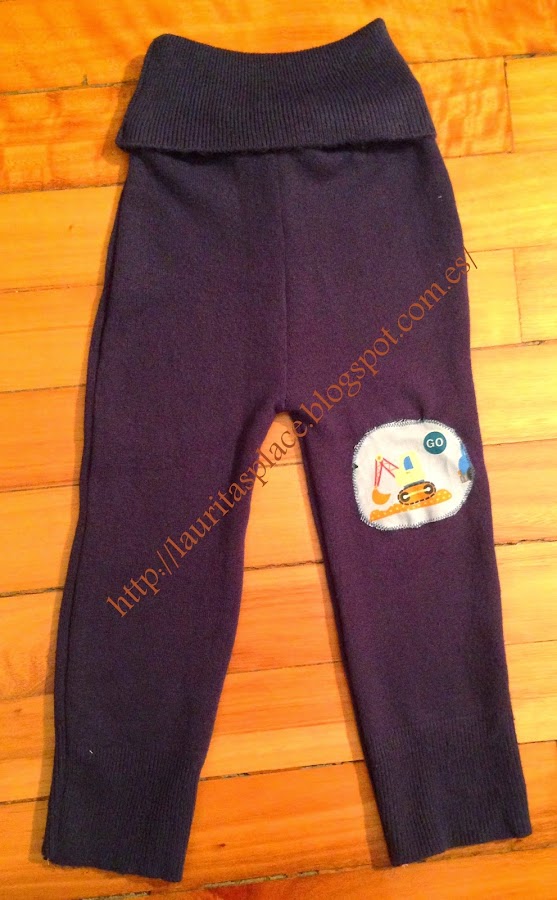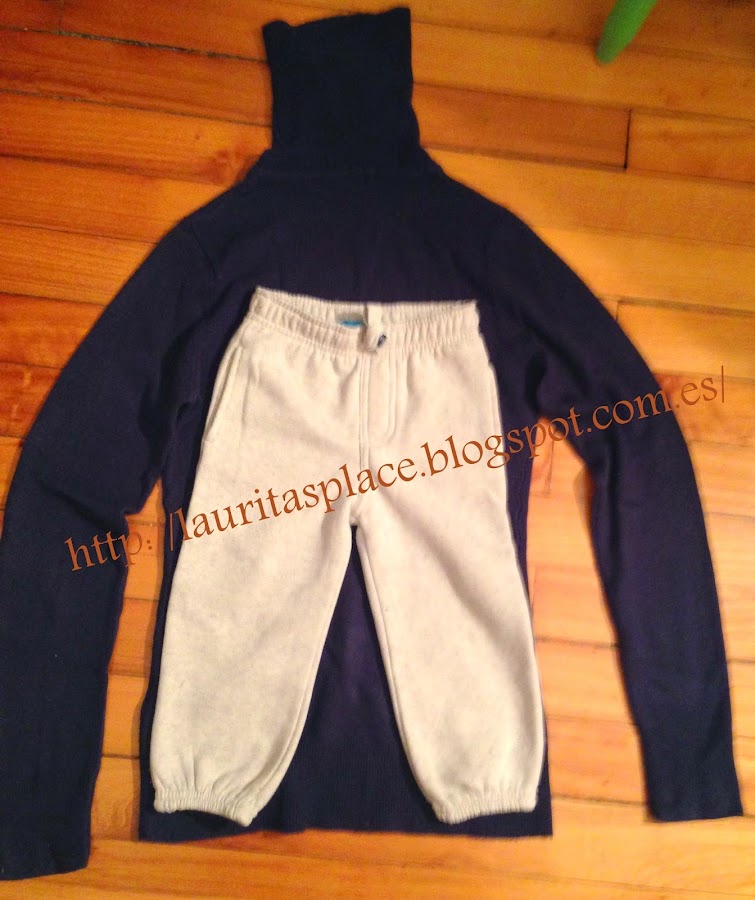 He aprovechado uno de estos jerseys para cortar unos pantalones usando como patrón un pantalón de chándal. Como mi peque ya casi tiene dos añitos ya no me sirve el modelo de reciclado "de mangas a pantalón" porque ya tiene casi las piernas más largas que mis brazos y encima le quedaría muy estrecho así que he utilizado el cuerpo del jersey.