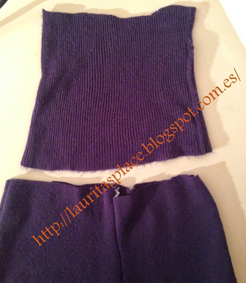 Para hacer la cintura he cortado el cuello del jersey y lo he colocado de manera que quedase la "parte buena" del cuello hacia arriba para luego darle la vuelta. Para ello meter el cuello en el interior del pantalón, encarando la parte del derecho del cuello con la parte interior del pantalón.