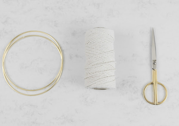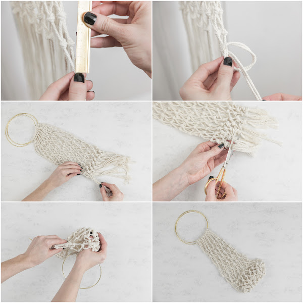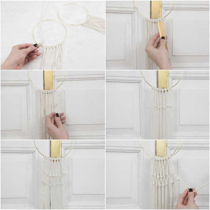 Para poder realizar bien la labor de macramé, necesitamos agarrar los aros, podemos utilizar una pinza o lo podemos colgar de alguna parte. La primer tira de nudos la hacemos a 6 cm del aro.