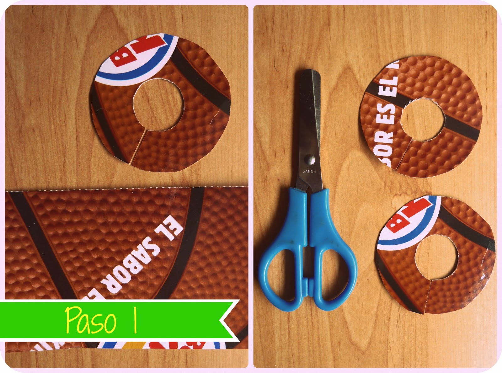 1. Cogemos un trozo de cartón (podemos reciclarlo de una caja de cereales por ejemplo) y recortamos dos moldes con forma de rosquilla como los de la foto. En función del tamaño que escojamos, el pompón saldrá más grande o más pequeño. Os aconsejo además hacer un cortecito en la en la rosca, para que luego os sea más facil pasar la lana, sin necesidad de tener que pasar todo el ovillo por el agujerito.