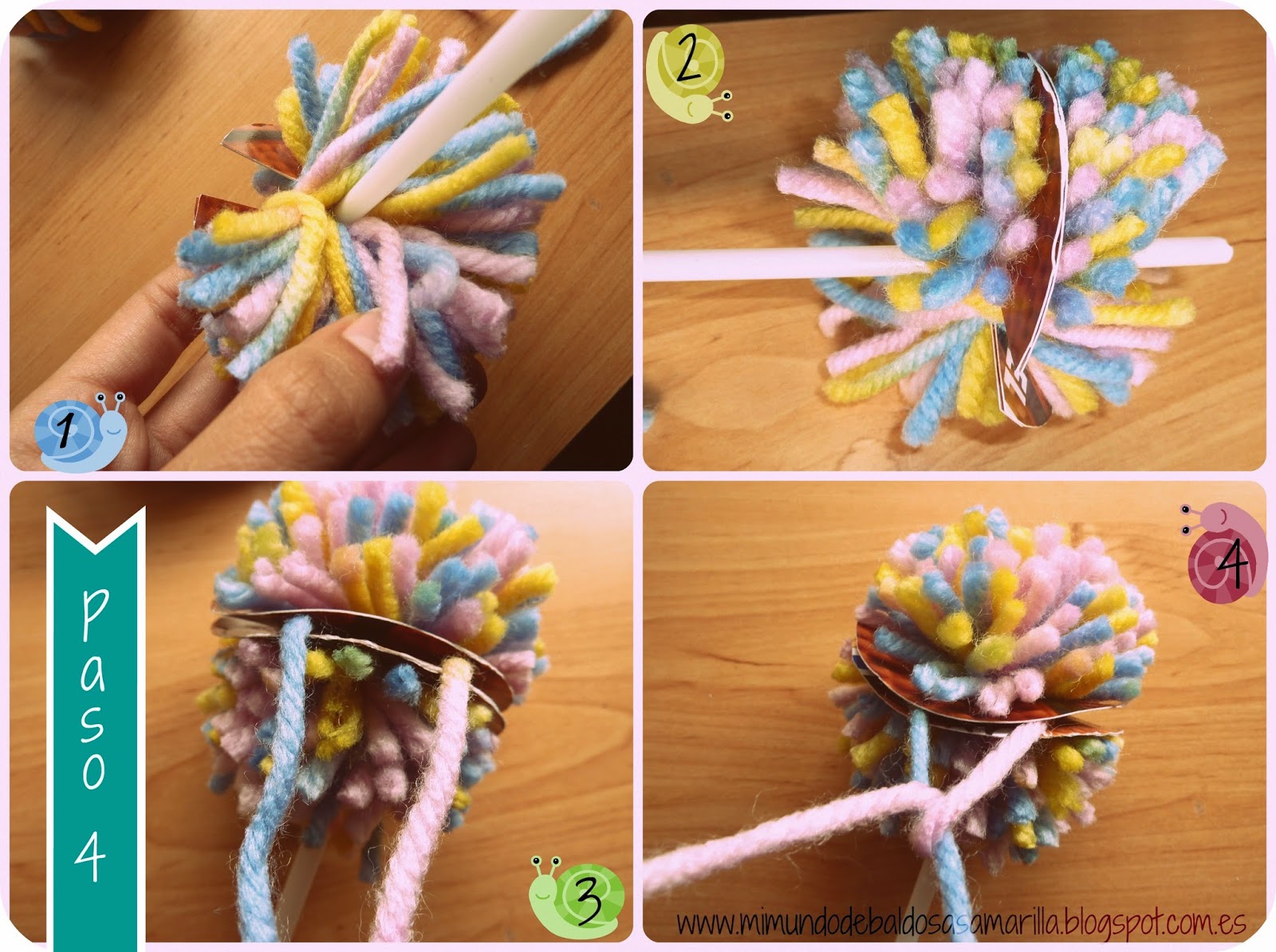 3. Cuando ya esté totalmente forrada (cuanto más lana, más compacto, blandito y gustoso queda el pompón) tenemos que cortar la lana de todo el contorno de la rosca, pasando las tijeras entre los dos moldes, con cuidado de que no se nos escape la lana que habíamos liado con tanto cuidado! ;)