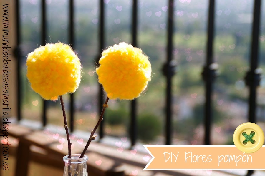 Para hacerlas hacen falta poquísimos materiales por un lado, lana del color que queráis (en mi caso amarilla, aunque creo que un tonito beige o un rosa palo también podrían quedar divinamente), cartón y tijeras. Y por otro, ramitas secas que podemos recoger de algún parque o zona de campo (si no las tenemos, o no las queremos ir a buscar, también podemos utilizar alambre, palos de pinchitos o cualquier otro material que se os ocurra que puede cumplir bien el papel de tallo para nuestras flores; aunque a mi, personalmente, me gusta el toque que da una rama natural ;) )
