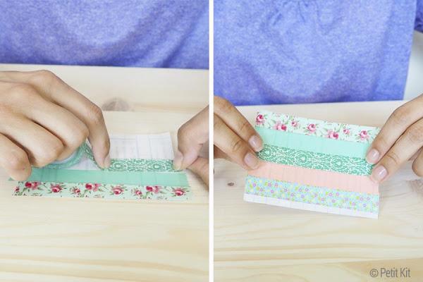 Sobre un trozo de papel encerado vamos pegando tiras de whasi tape de distintos estampados y colores. Podemos utilizar el papel de horno o el de forrar libros quitándole el plástico transparente y utilizando la base blanca.