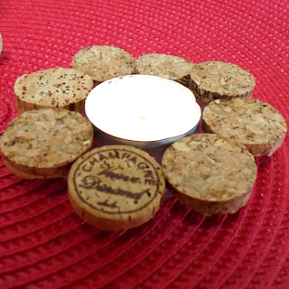 3. PORTAVELAS: creado sobre una tapa de cristal que no se utilizaba. Pegué unas rodajas de corcho encima. Vela dentro, listo.
