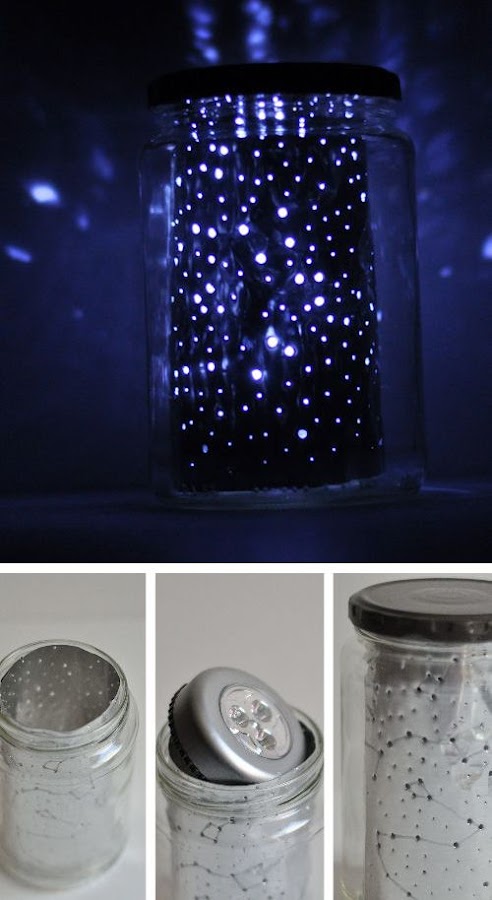 - Constelación de estrellas: Agujera con un punzón una bandeja de aluminio, de modo que "crees" constelaciones estelares, después métela en un tarro de cristal e inserta un pequeño LED en su interior.