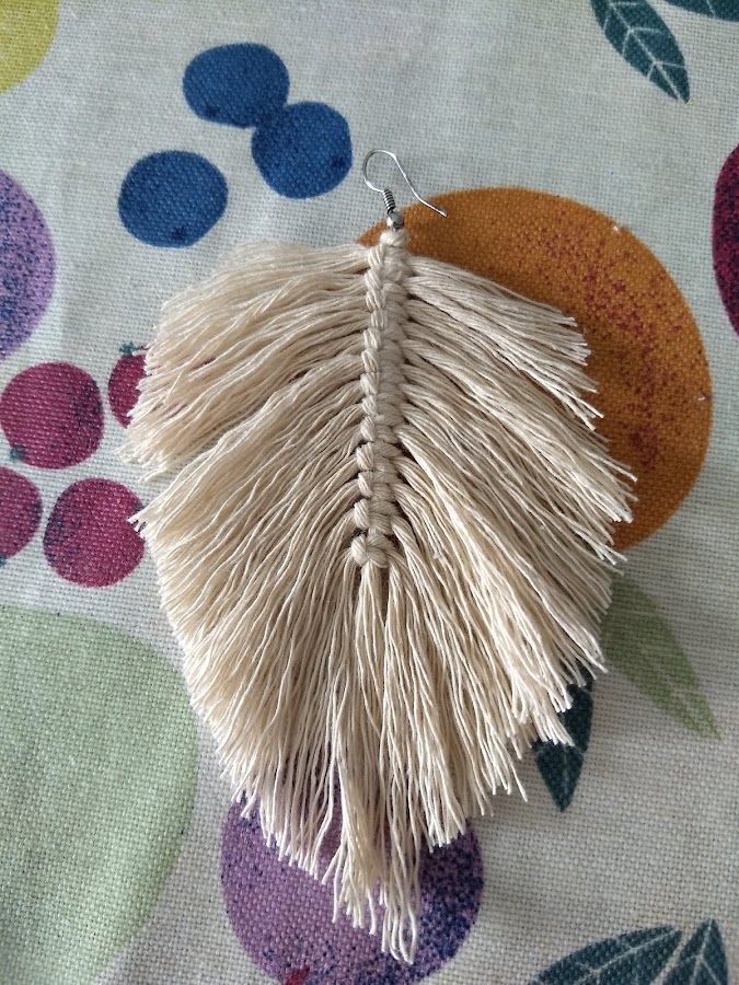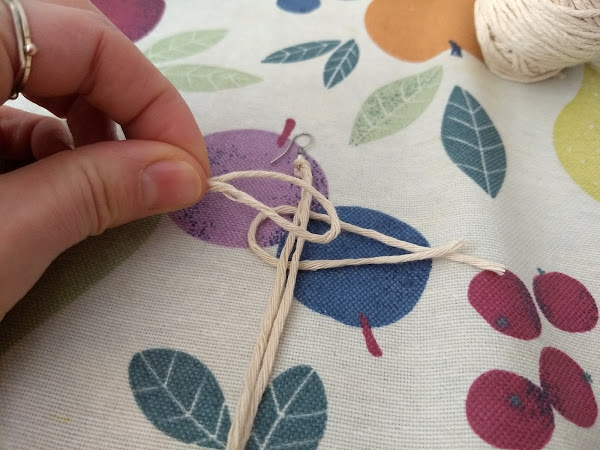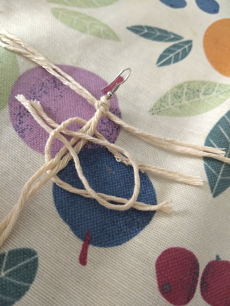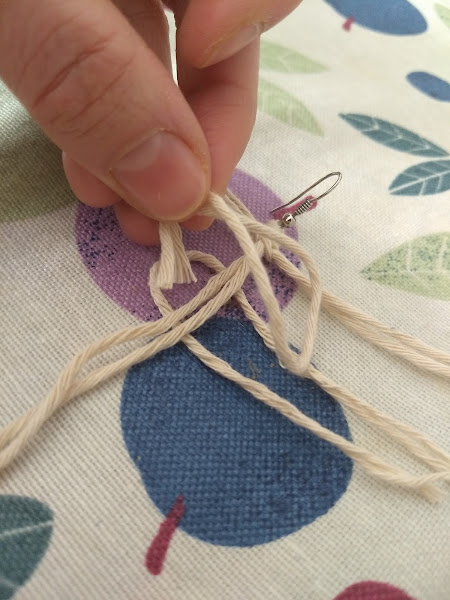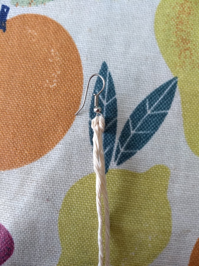Lo primero que haremos será cortar 20 centímetros del hilo de macramé que introduciremos por el gancho del pendiente. Haremos un nudo.