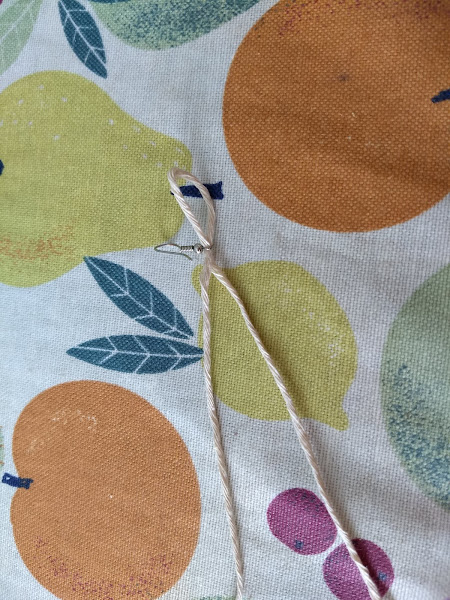 Ahora los extremos de este último los introducimos por dentro de la doblez del hilo que ya estaba colocado.