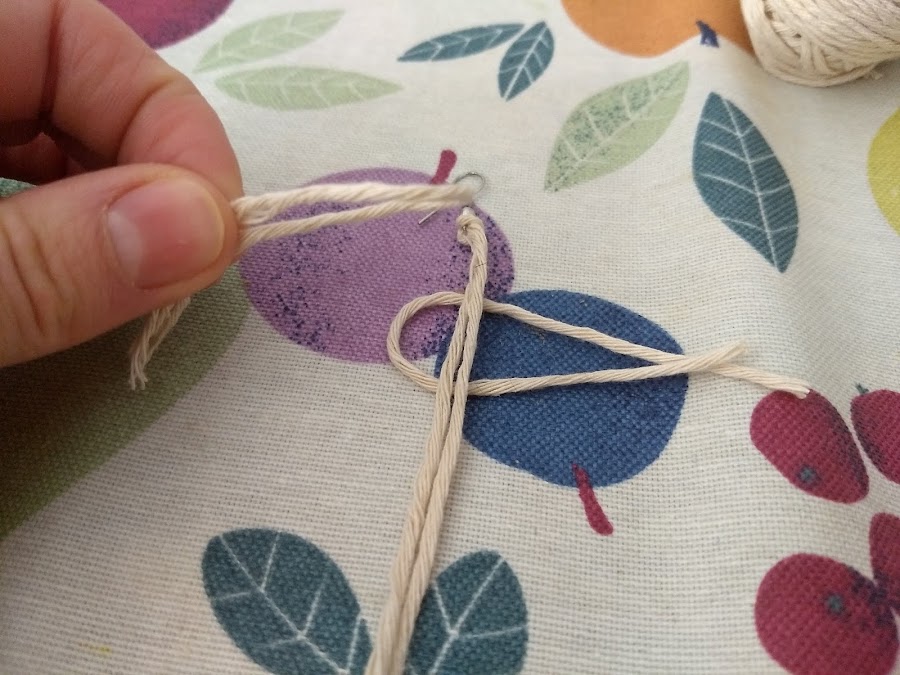 Atentos al paso, es muy fácil pero hay que hacerlo bien para que nos queden bonitos: pasamos un hilo por debajo de la base doblado a la mitad, por ejemplo, el derecho.