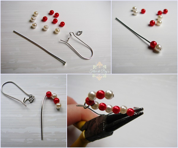 Metí 4 bolitas en la aguja o pasador de cabeza plana, alternando el color. Empece por la blanca y después de la segunda roja doble con los dedos el alambre para conseguir la forma de bastón.