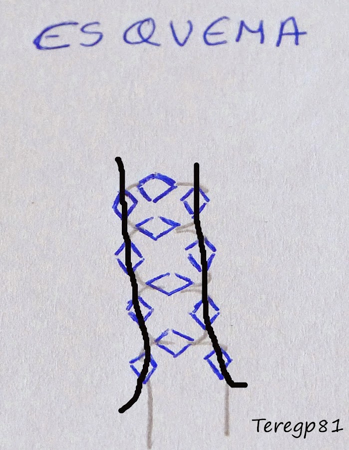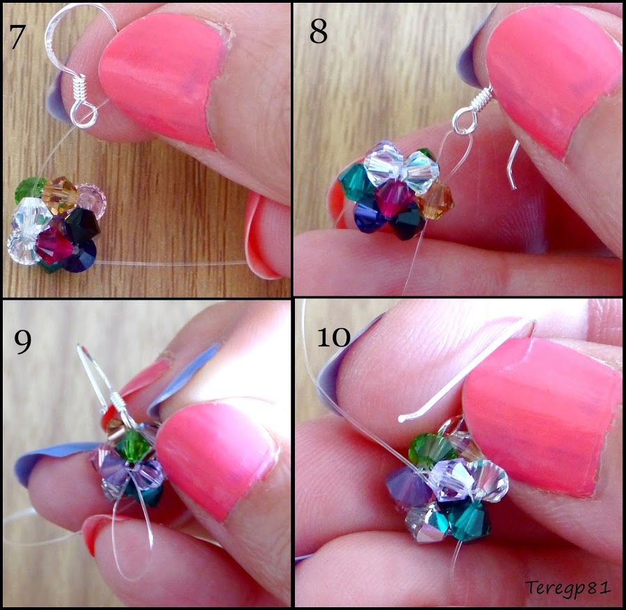 Todas las piezas que se hacen con tupies y nylon tiene un esquema, una vez que aprendemos a seguir las indicaciones podemos hacer cualquier forma. Normalmente se trabaja con un trozo de hilo del que vamos a sujetar los dos extremos en una mano y empezar a colocar cristales según el esquema por un extremo u otro. Este dibujo nos muestra que debemos comenzar con 3 tupies y un cuarto en el que vamos a cruzar los dos extremos (uno en sentido contrario del otro). A continuación un tupi por cada punta y otro por el que cruzaremos los dos hilos. Se repite este paso y por último introducimos un cristal por cada extremo. Aquí tenéis las fotos y el vídeo: