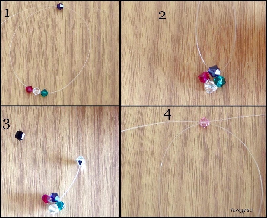 1. Comenzamos colocando los 3 primeros, y un cuarto por el que cruzamos los dos extremos del nylon en sentido contrario.