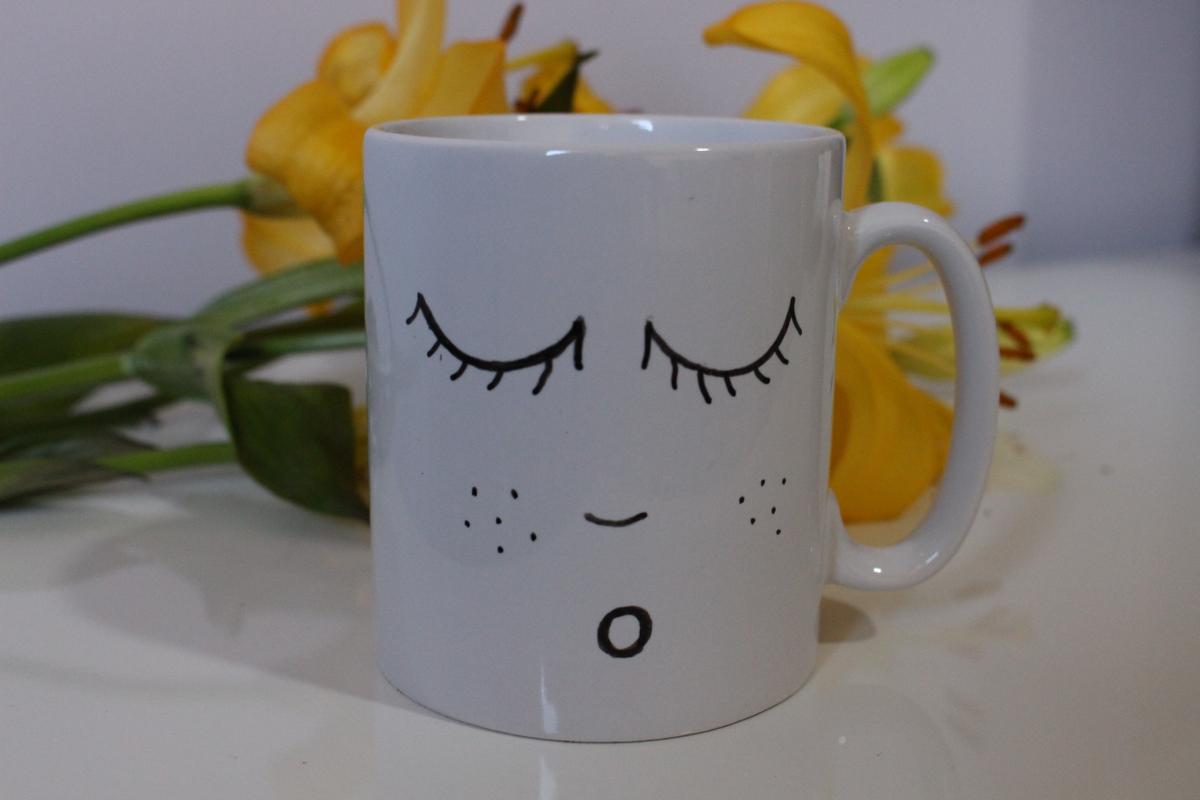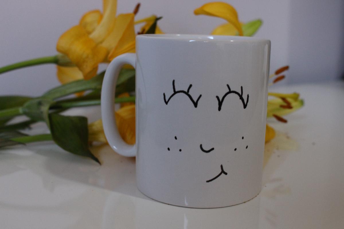 Volviendo al tema, me animé a probar con una taza blanca (sí, de esas de 80 céntimos del bazar…). Realicé el dibujo, lo dejé secar un par de horas (si no sois unos ansias como yo, podéis dejarlo 24h como recomienda en el prospecto) y lo introduje al horno durante 30 min. a 200ºC.
