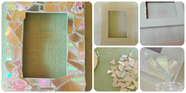 Primero pintamos, mientras la pintura seca, cortamos en trozos nuestros cds (es la parte más tediosa del diy), y luego una vez seca la pintura, a colocar nuestros trocitos de la manera que mas nos guste!