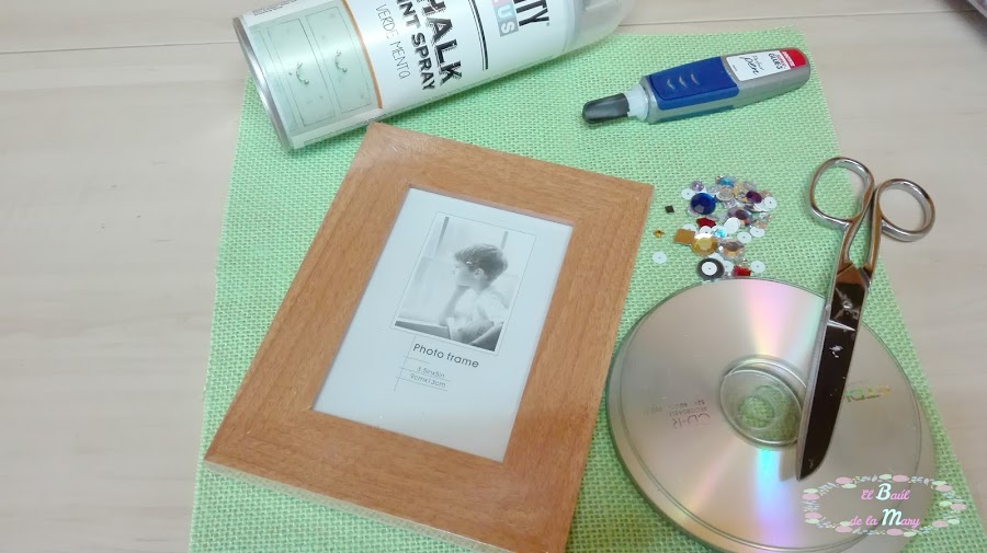 Un marco de fotos, chalk paint, viejos cds, tijeras y nuestro super pegamento Super Glue Perfect Pen.