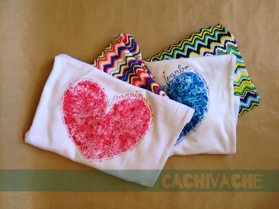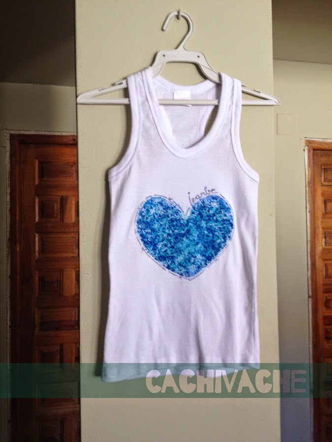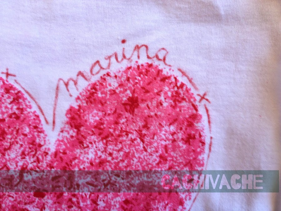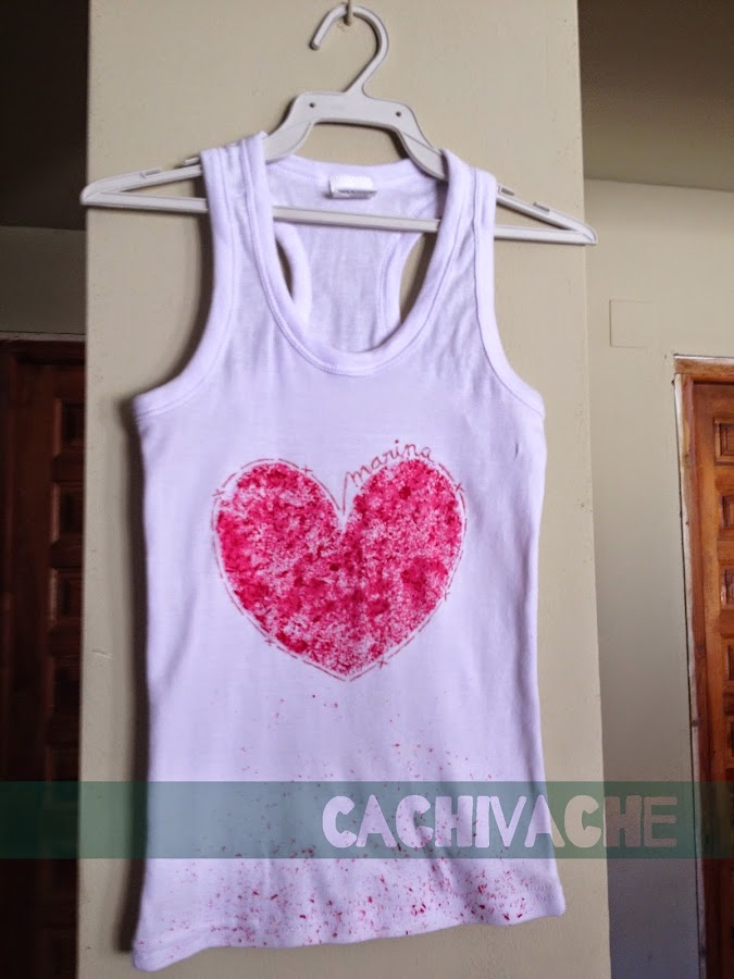 1- Realizamos una plantilla de la forma que queráis, en mi caso un corazón, pero puede ser una estrella... o incluso letras. Para ello hacemos un dibujo y recortamos para dejar libre lo que queremos estampar. La colocamos en la camiseta y metemos un cartón entre ésta para que no pase al otro lado.