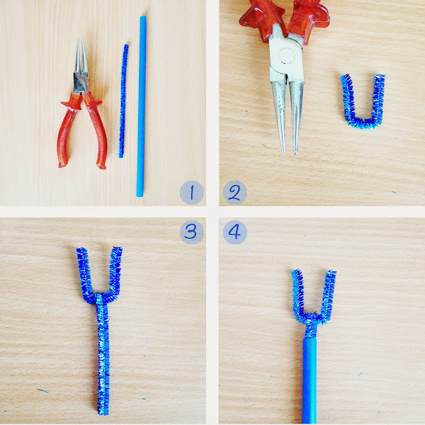 1) Coge una pajita y un limpia pipas. Con ayuda de unas tijeras parte el limpia pipas por la mitad.