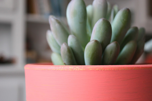 Pinté el borde superior de dorado, pero como no me gustaba del todo el resultado, pinté encima con un color coral. Lijé alguna zona para que saliera el dorado y entonces sí, el efecto desgastado me convenció ;) El cuerpo central de la maceta la pinté en blanco y el plato de la base en dorado.