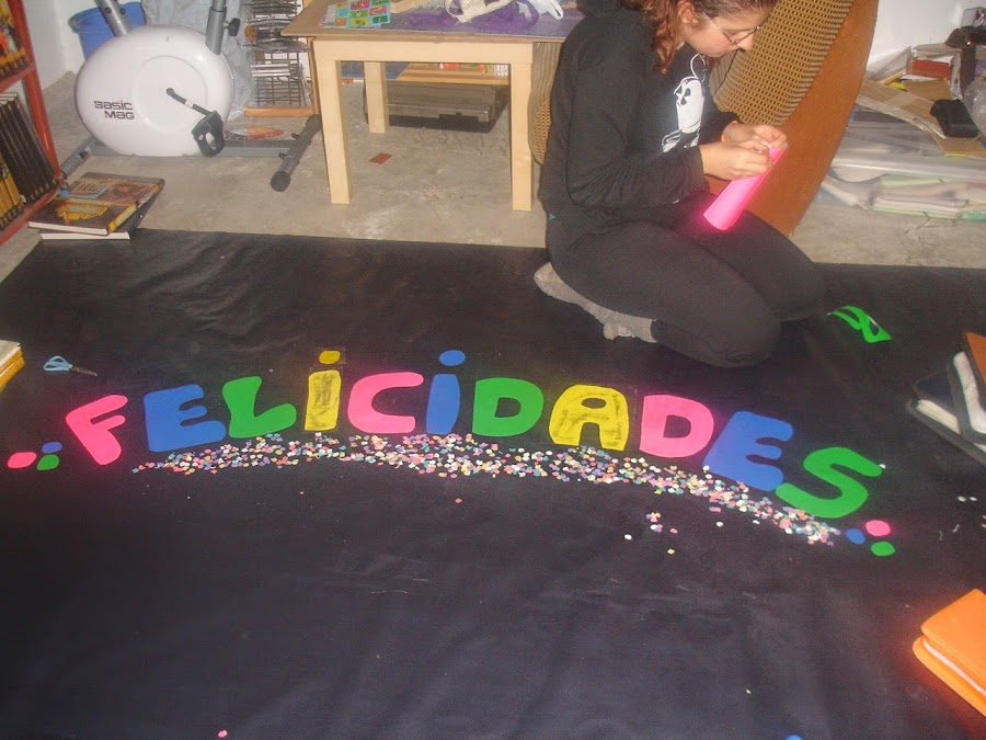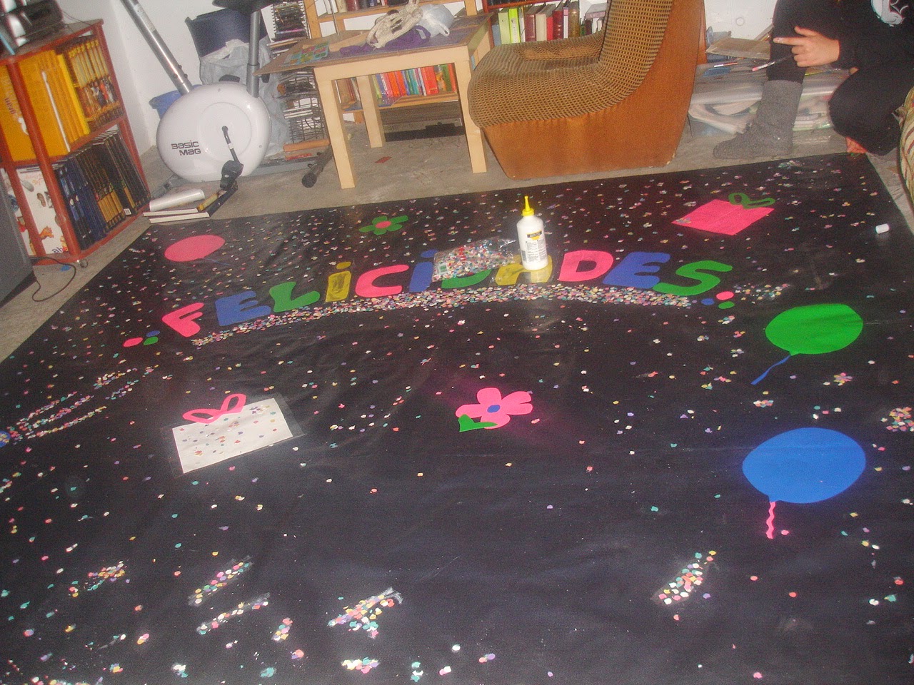 Como la temática de nuestra fiesta era un cumpleaños recortamos en los forros de colores tanto las letras de la palabra FELICIDADES como globos, matasuegras, regalos, una tarta, alguna que otra flor....