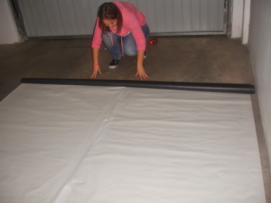 1º Extendemos el mantel en el suelo, el nuestro era de 5 metros por lo que lo dividimos justo por la mitad y lo pegamos con cinta celo ancha para que quede unido.