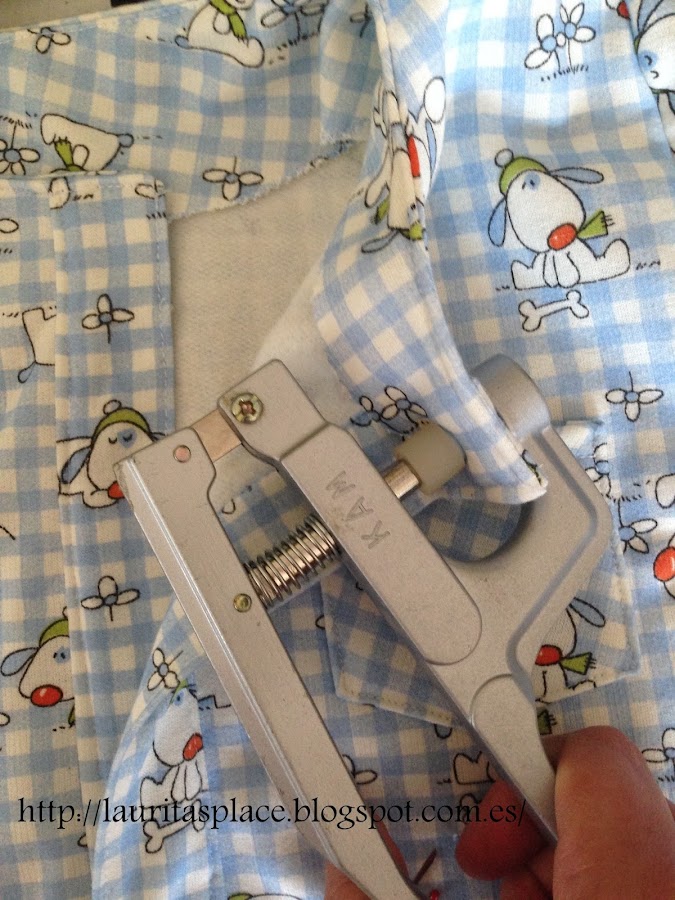Como la tela me ha quedado gruesa utilizo el punzón para hacer los agujeros y Zas! en 5 minutos tenemos los Snaps colocados. un lujazo no?