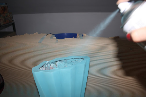 Os aconsejo que preparéis la zona alrededor de la que trabajéis porque al ser pintura en spray evitaremos manchar más de lo necesario. Como veis en las fotos, coloqué un cartón detrás del jarrón.