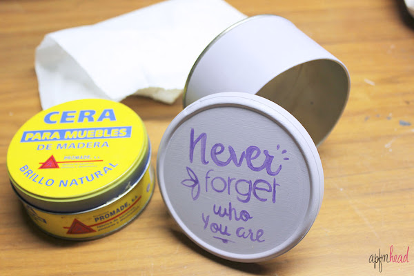 Busqué una frase bonita, combiné varias tipografías y con pintura más oscura y un pincel fino escribí la frase "Never forget who you are" en la tapa de la caja.