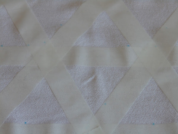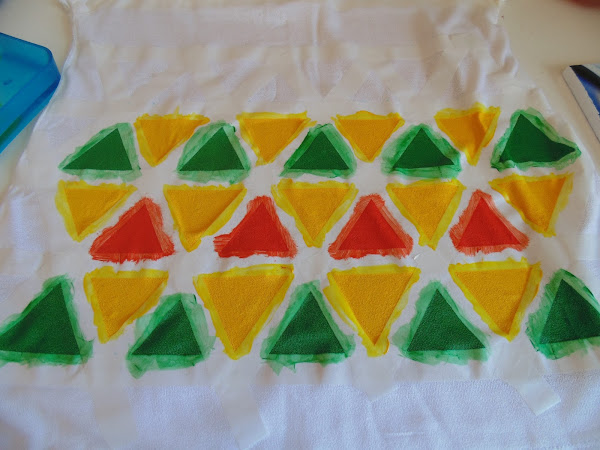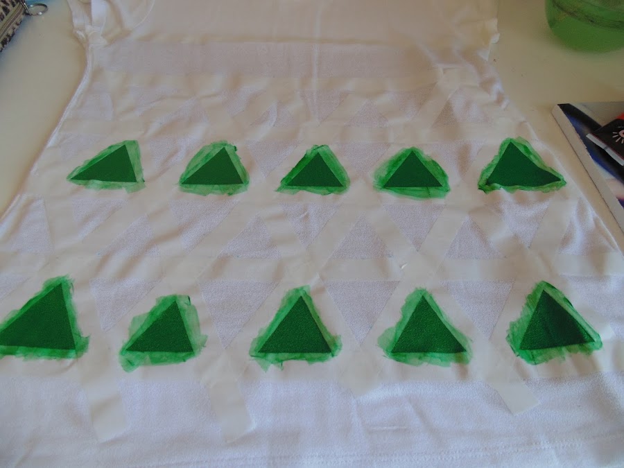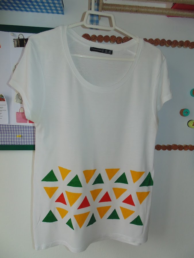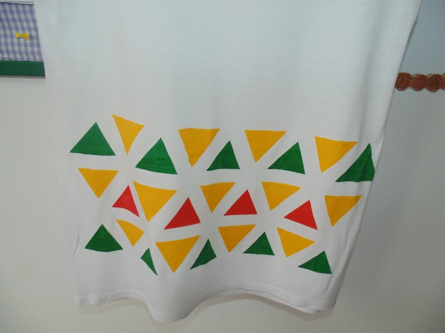 A seguir, fue formando los triángulos con la cinta (no se ve muy bien en la foto, porque la cinta era blanca y la camiseta también).