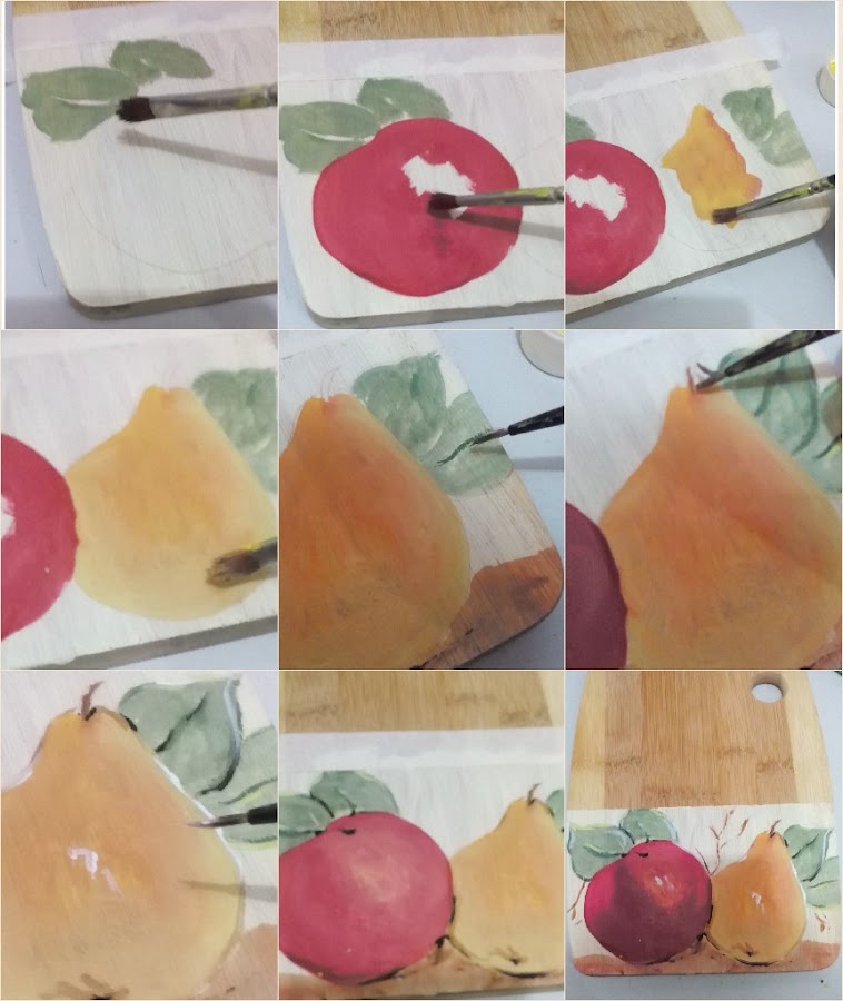 Y empezamos a aplicar aguadas, iniciamos con el verde de las hojas, luego el rojo para la manzana y finalizamos con los amarillos-ocre de la pera