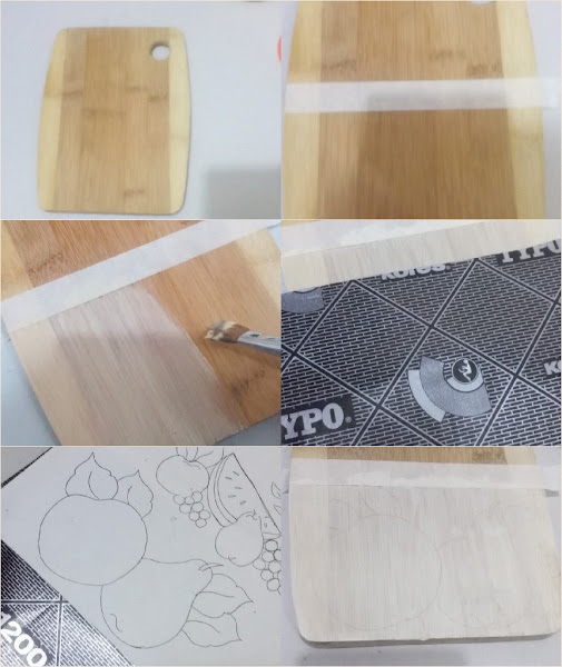 He pintado con aguadas, colores acrílicos diluidos, he dividido la tabla con cinta adhesiva y en la parte inferior pasamos la primera aguada en color crema, si pueden notar el fondo aun muestra las vetas de la madera, ventaja de las aguadas (la transparencia)