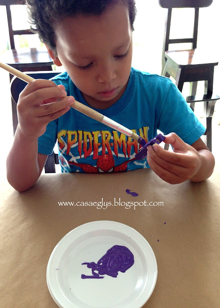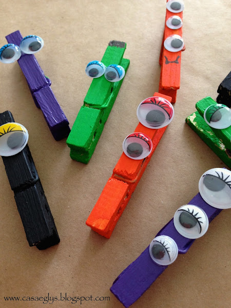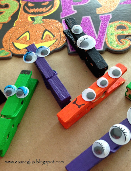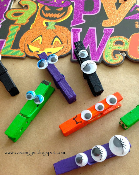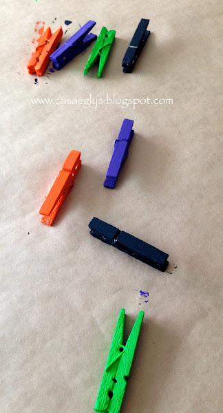 Comienza pintando las pinzas con colores típicos de Halloween: morado, negro anaranjado y verde.