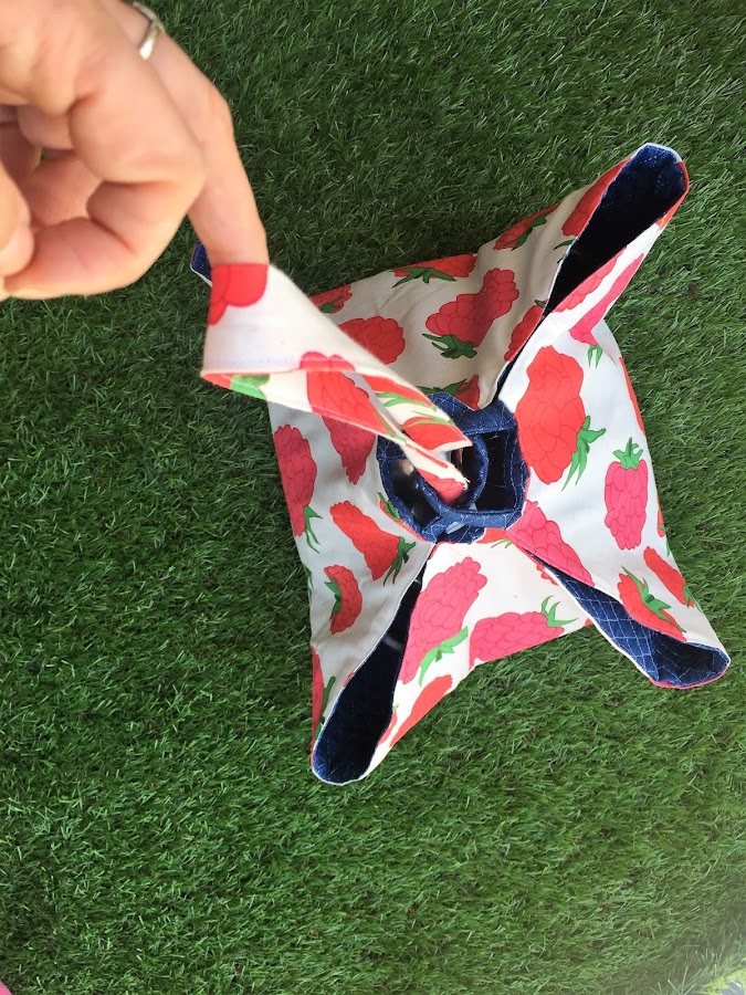 Damos la vuelta al cuadrado por el trozo que hemos dejado sin coser y daremos un pespunte al borde todo alrededor y así quedará totalmente cerrado el cuadrado y perfectamente rematado. Además sujetamos los dos extremos de la tira de frambuesa larga en las dos esquinas que tenemos sin nada, un extremo a cada esquina.
