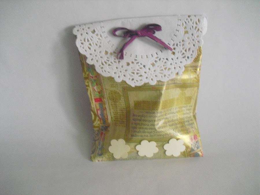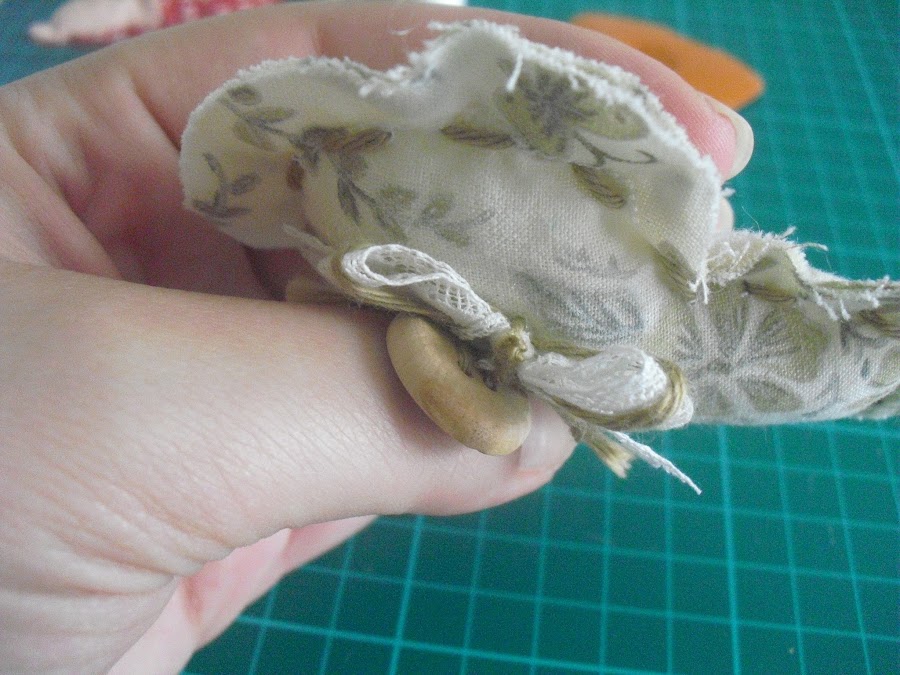 Un lacito de puntilla, si, mi puntilla preferida... con un botón clasico de madera, todo cosidito, hoy nada de cola!!! ?