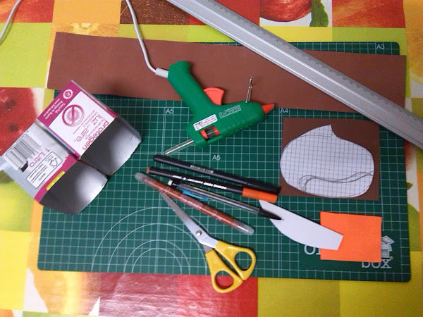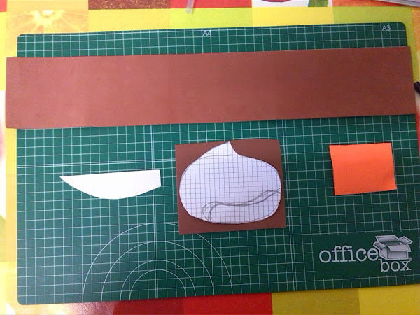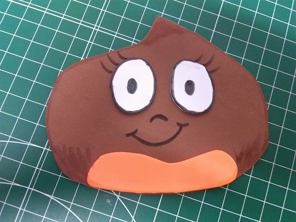 también he aprovechado dos recortes de goma eva, una blanca para hacer los ojos y la naranja para hacer el botón de la castaña.
