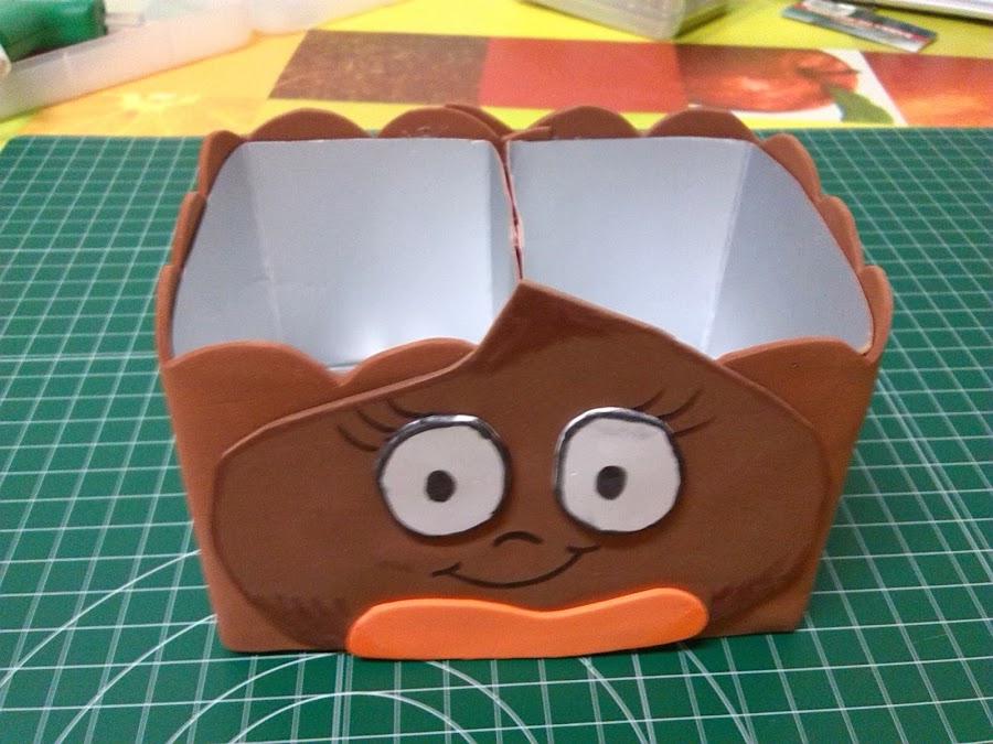 Con la pistola pegue los ojos y el botón y con un rotulador negro permanente dibuje los ojos, las pestañas, la nariz y la boca. Luego con un rotulador marrón le hice unas sombras a la castaña y con un rotulador naranja también sombree, el botón.