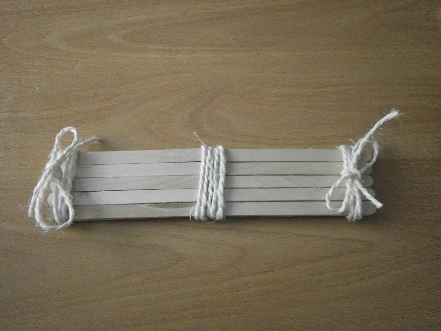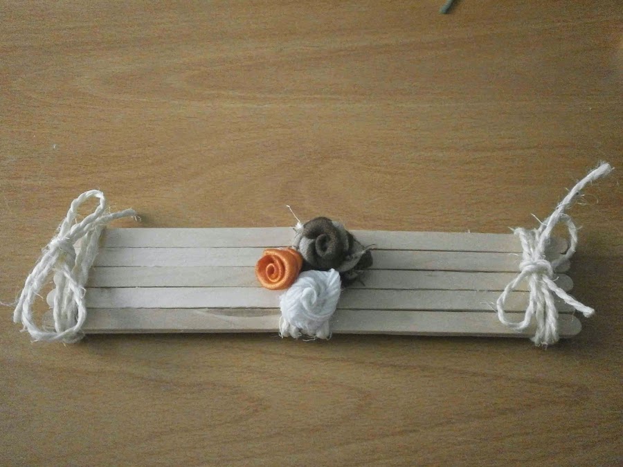 Materiales: Palitos de helado, silicona, cuerda sisal, retales de tela, puntilla para las velas.