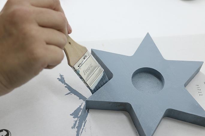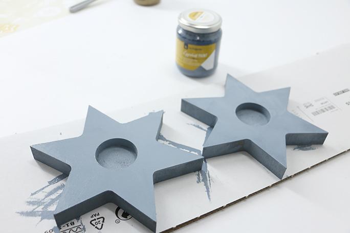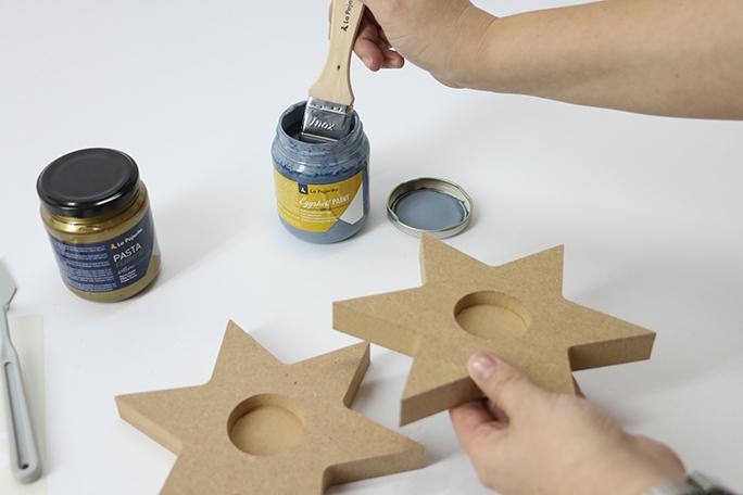 El primer paso, por supuesto, es pintar las estrellas. En nuestro caso las dos las hemos pintado con un tono de azul de la gama Eggshell de La pajarita. Muy cubriente y de secado rápido, por lo que es ideal para un DIY como este.