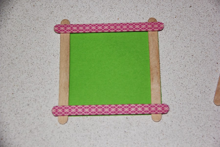 4 - Colocar sobre éstos dos de los palitos forrados, uno en cada extremo y respetando los límites del cuadrado de cartulina y pegarlos.