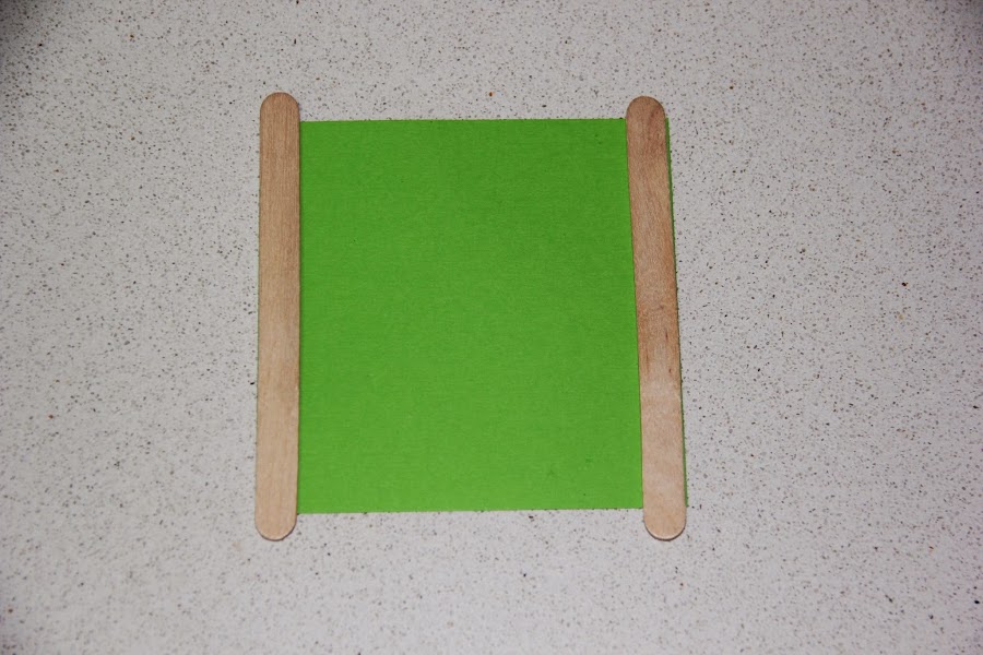 3 - Colocar sobre el cuadrado de cartulina los dos palitos sin forrar. Uno a cada lado de la cartulina, tal y como se muestra en la imagen, sin pegar.