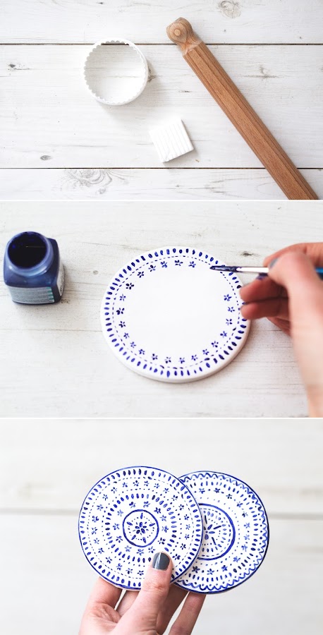 5. Una vez frías, pinta un diseño, el que más te guste, sobre las piezas. Todas serán únicas. Puedes probar primero un diseño sobre un papel y después lo copias en los posavasos. La pintura debe ser para cerámica.