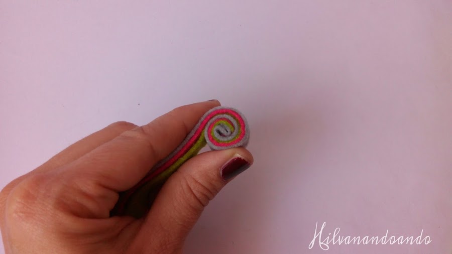 4._ Dobla la primera tira cubriendo las otras dos y enrolla poniendo pegamento para que quede bien sujeto.