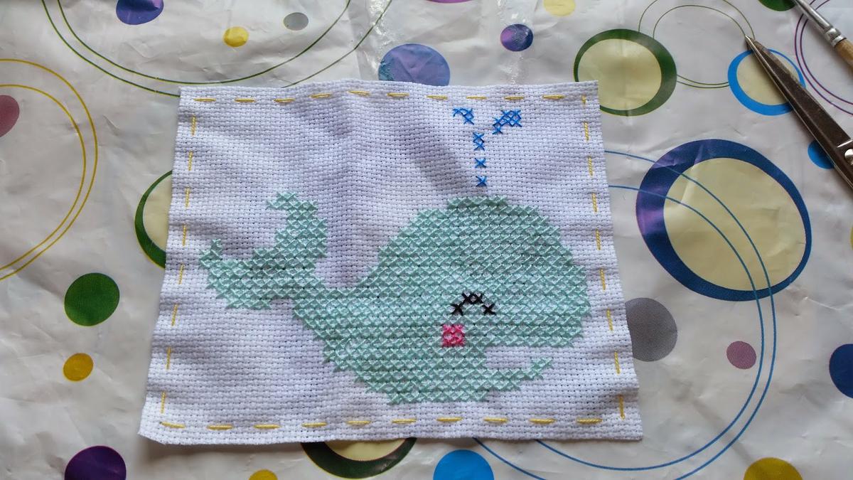 Lo primero, tendremos que tener ya realizado nuestro diseño en punto de cruz. Lo recortamos dejando el margen que consideremos y encolamos el borde para que no se nos vayan los hilos.