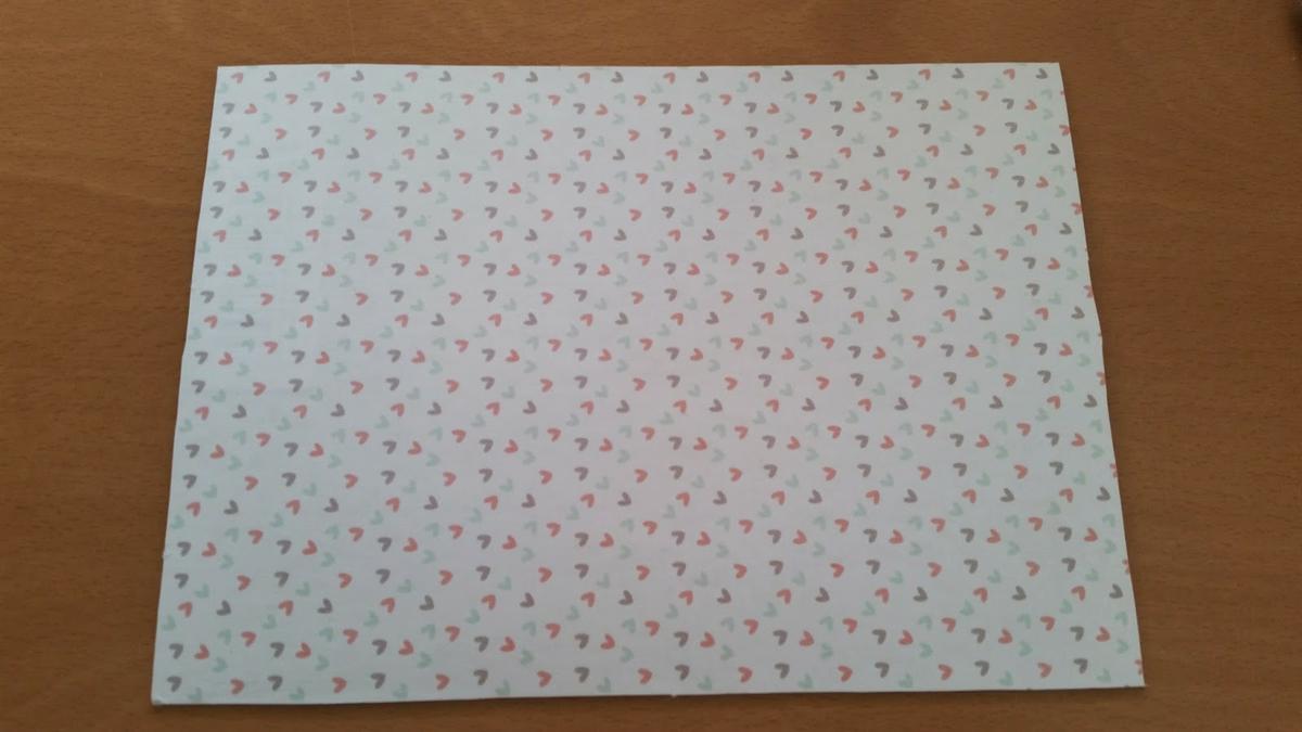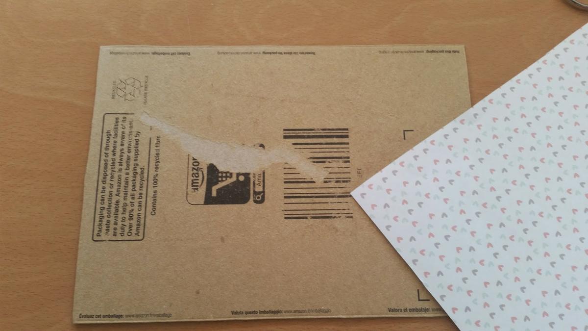Mientras va secando, realizaremos la base con un cartón o cartulina. Si, como en mi caso, el cartón tiene letras, le ponemos un estampado que las tape. Yo elegí este que tenía por los cajones, y lo pegué con pegamento en barra.
